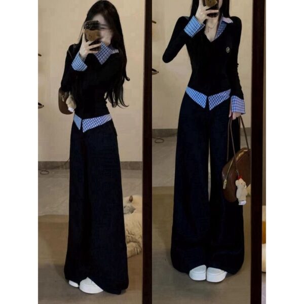 Thin navy-blue hoodie hooded long pants 2pcs set for women