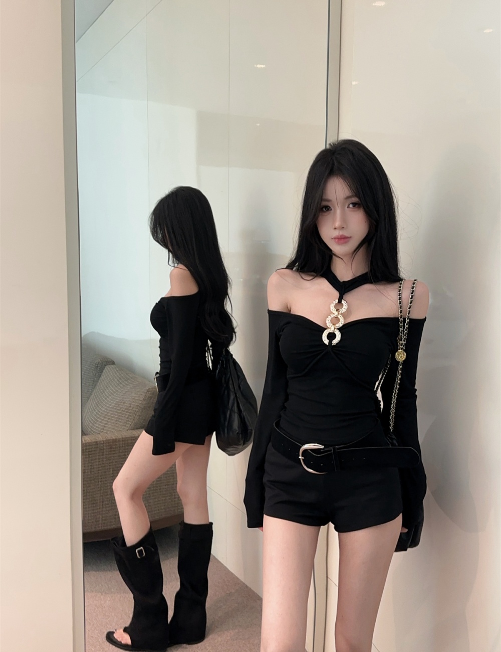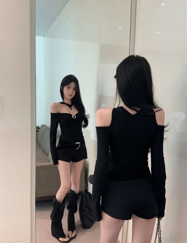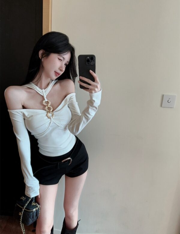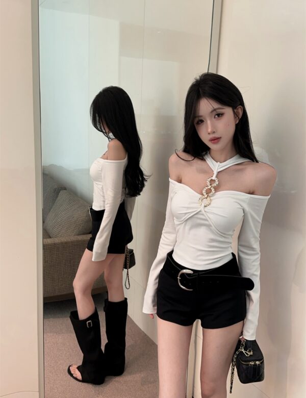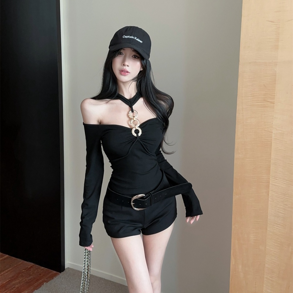 Halter metal ring tops fashion long sleeve T-shirt